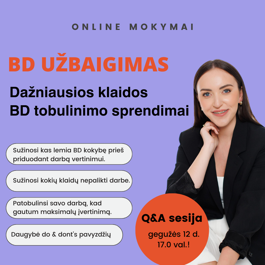 Užbaiginėji baigiamąjį ar kt. rašto darbą? Įsitikink, kad neliko klaidų! 🧐 Mokymai „Baigiamojo darbo užbaigimas. Dažniausios klaidos ir tobulinimo sprendimai“ skirti visiems studentams, norintiems sėkmingai užbaigti savo darbą – nepaliekant klaidų ir patobulinus darbą.