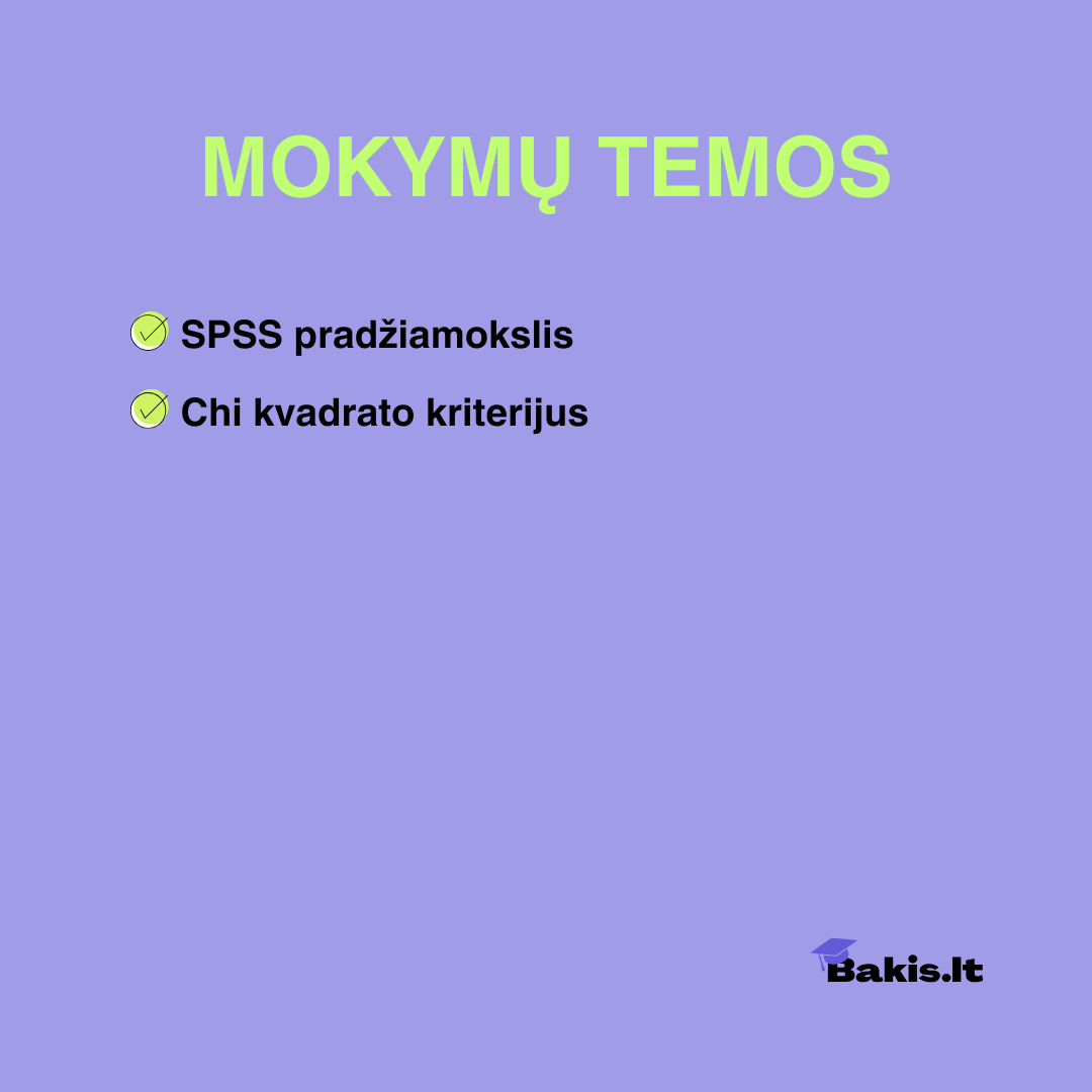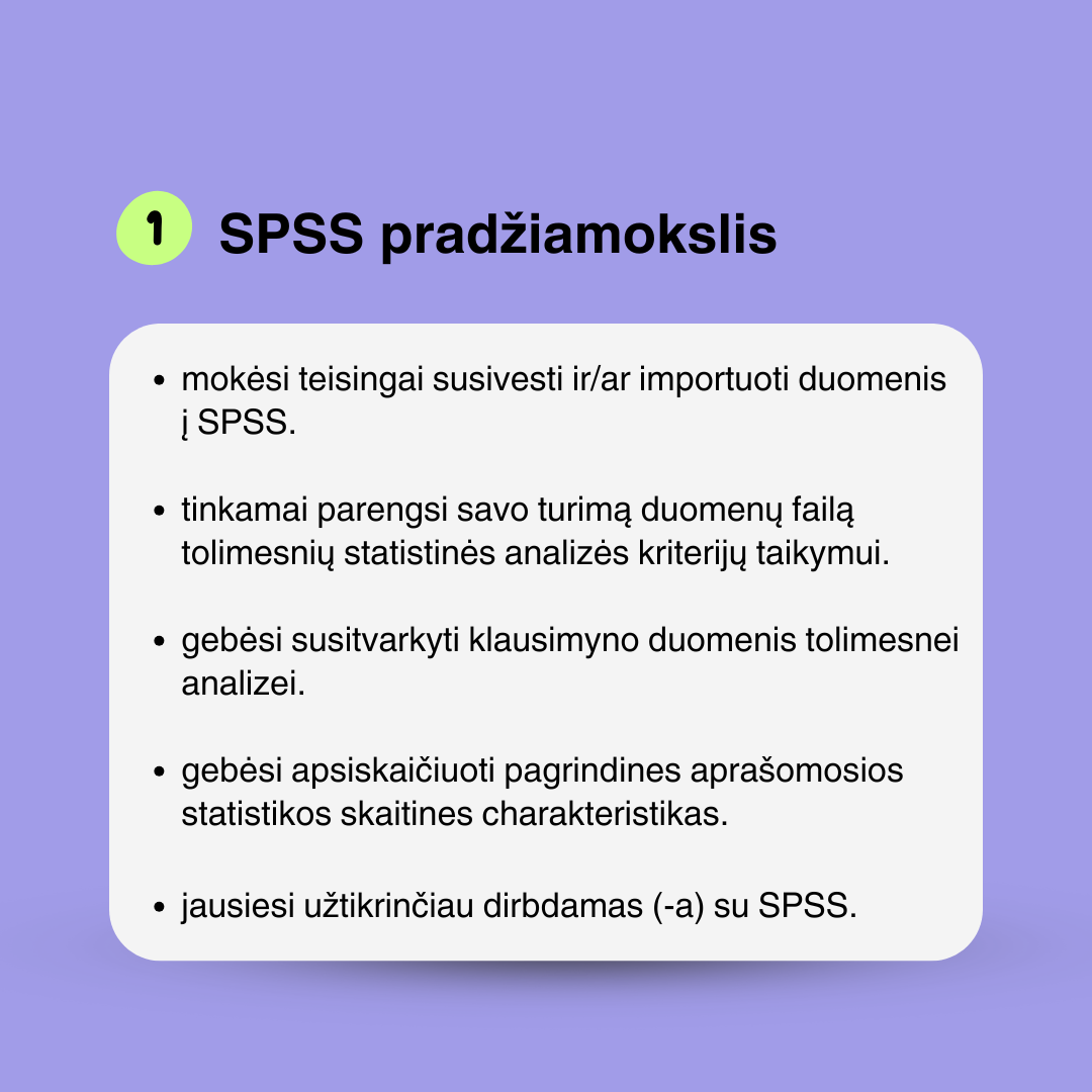 ,,IBM SPSS Statistics“ – programa, skirta duomenų statistinei analizei. Šie trumpieji mokymai skirti studentams, kurie nori atlikti analizę turėdami kokybinius kintamuosius – taikyti Chi kvadrato kriterijų ir/ar apskaičiuoti Kramerio asociacijos koeficientą.